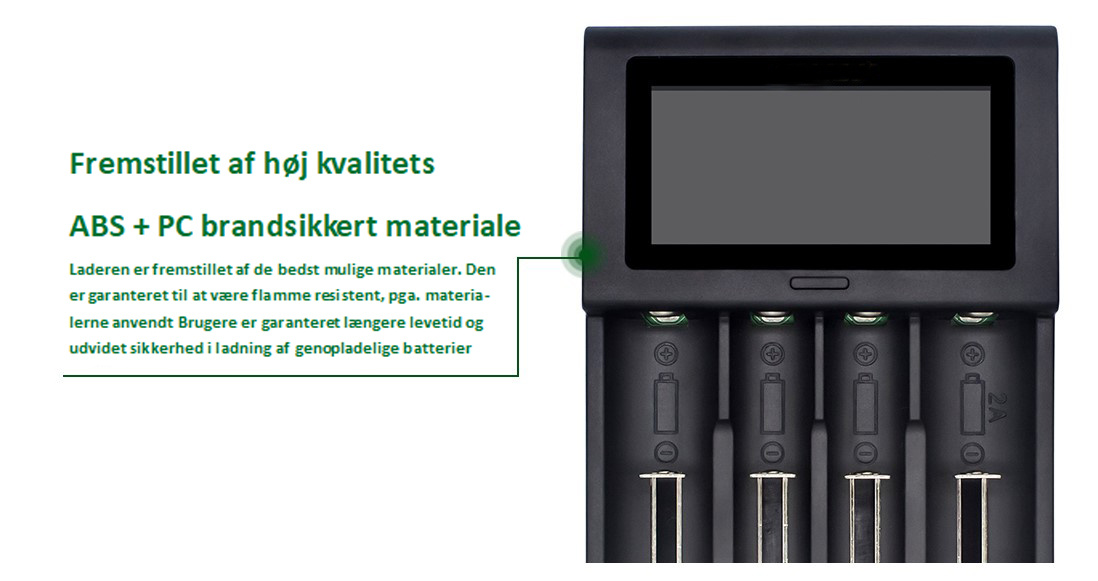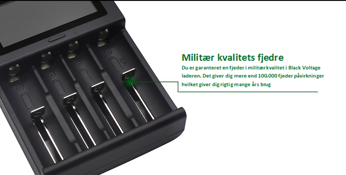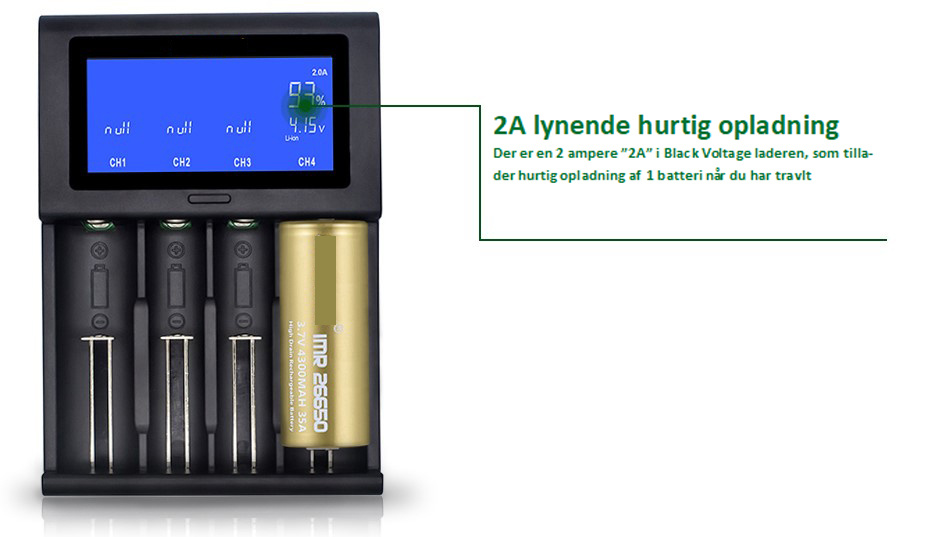 Black Voltage opladeren kommer med HD LCD skærm som tydeligt viser status på din opladning. Du kan lade fra 1 til 4 batterier adgangen og du kan følge med i %-delen af din opladning løbende.