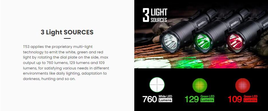 Den ønskede farve afhængigt af jagtsituationen justeres nemt med en drejekontakt. Forlygterne på dette jagt LED lys er imponerende: i hvidt lys når T53 en certificeret 220 meter. Det grønne lys når sande 160 meter og det røde lys kommer på bekræftet 125 meter.