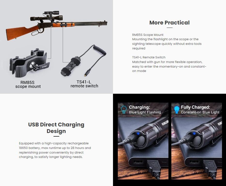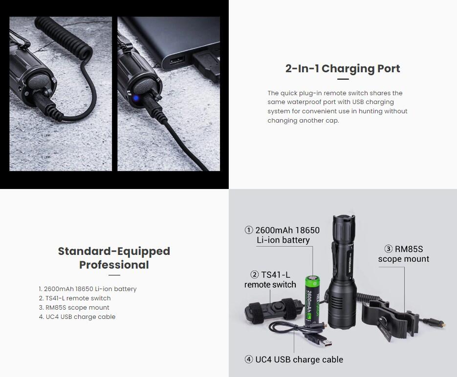Genopladeligt batteri, fjernkontrol samt Nextorch RM85S kvalitets montage følger med