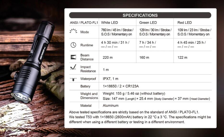 - Lumens:Hvid 760 lumens, Grøn 129 lumens, Rød 109 lumens