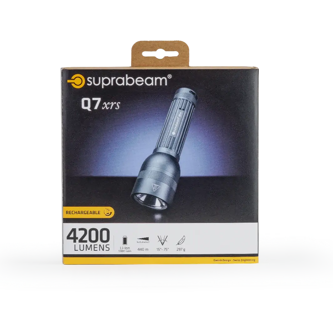 Den mest avancerede genopladelige lommelygte fra Suprabeam! Q7xr leverer ekstrem lysstyrke og maksimal ydeevne takket være en solid aluminiumreflektor og Thermal Heat-Sink, der udnytter hver en dråbe energi.