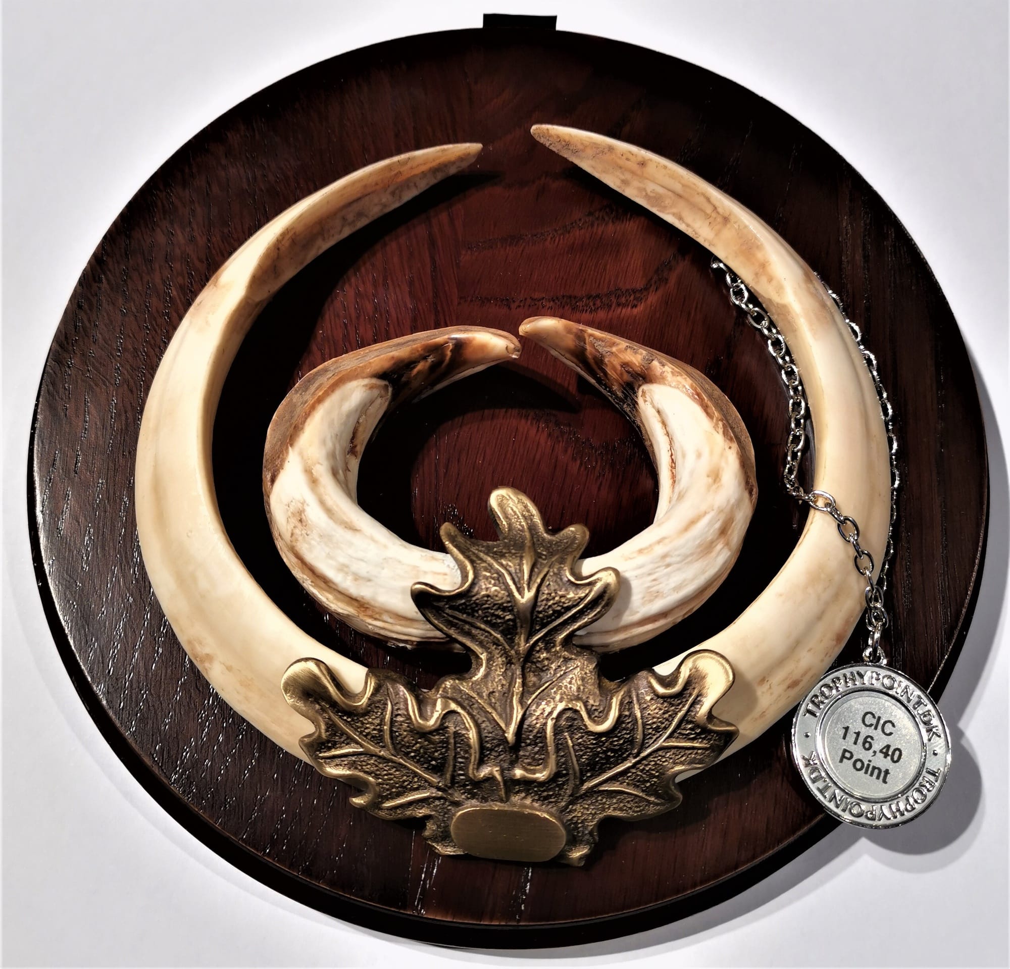 Mørkbejdse trofæplade på 11 cm. Velegnet til vildsvin.