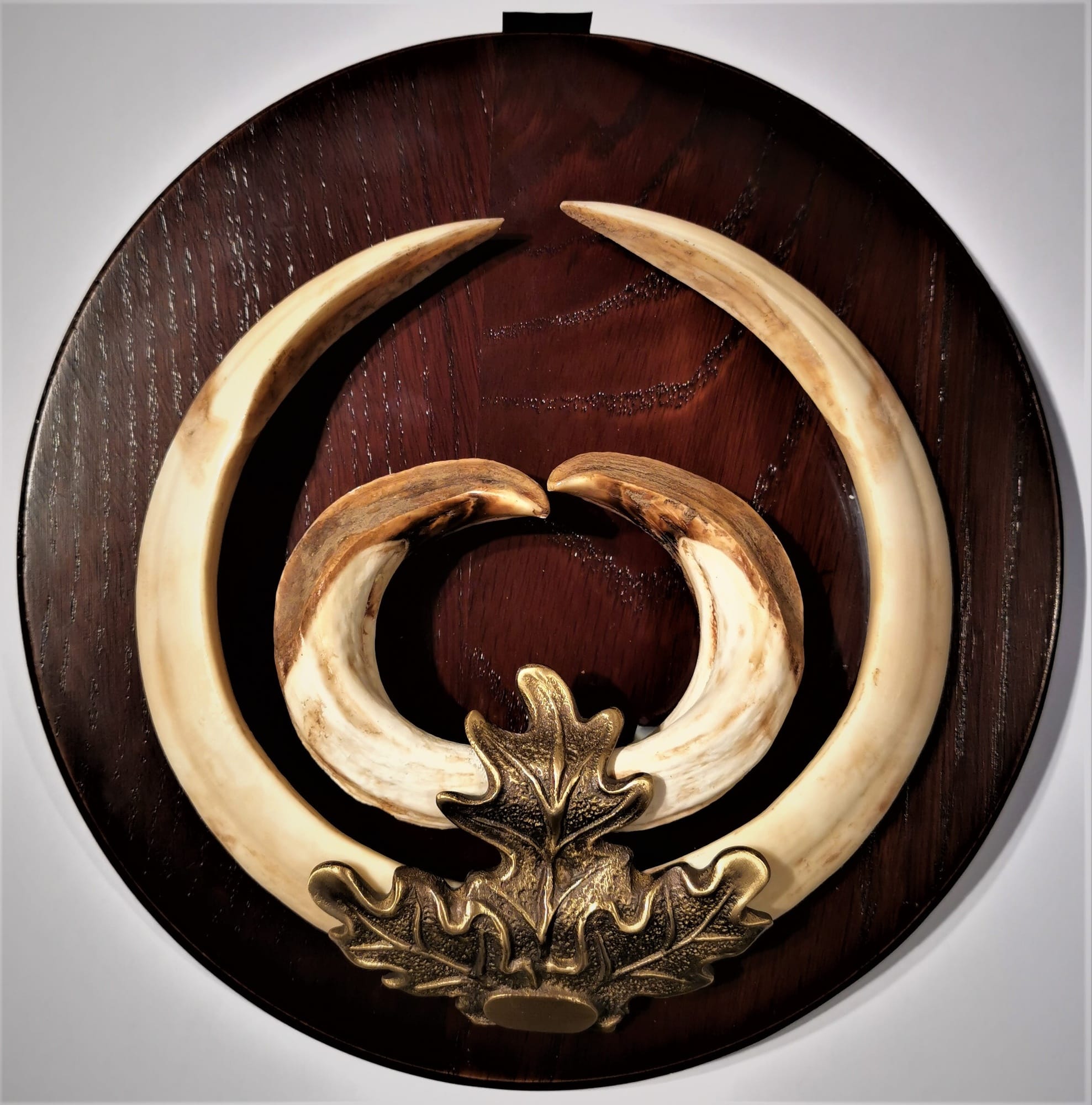 Flot trofæplade i mørkbejdset eg, velegnet til vildsvin. Kanten er fræset og på bagsiden er der lavet hul til ophængning.