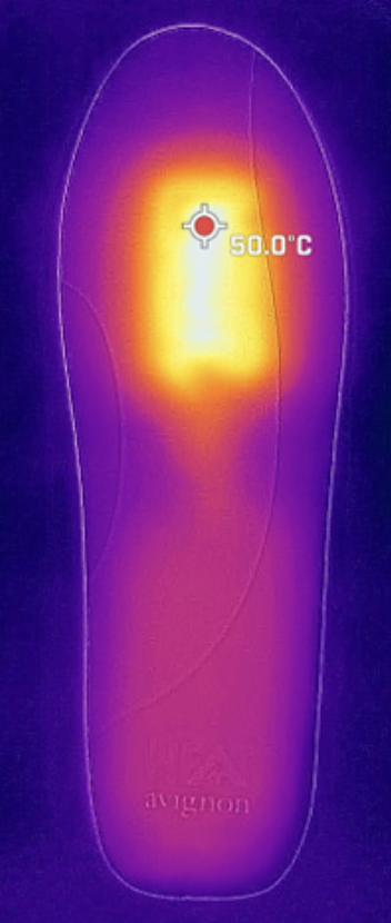 På højre side er en illustration, der viser varmefordelingen i en el-opvarmet sål. Billedet blev taget ved stuetemperatur, hvor produktet var sat til rødt niveau (60 grader). Selvom varmetrådene udsender 60 grader, viser billedet, at overfladetemperaturen på produktet er 50 grader.