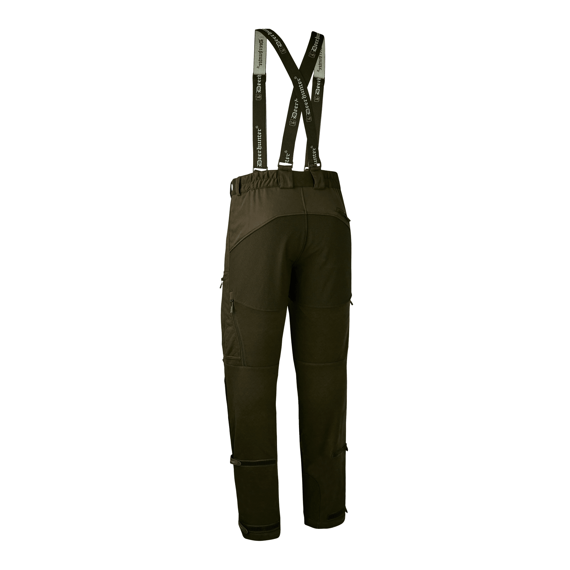 Knæene er formsyede og klar til knæpuder. Materialet om buksernes vigtigste områder – sæde, knæ og nederste del – er forstærket. Denne strækbare forstærkning sikrer, at man beholder fleksibiliteten, selv når terrænet bliver udfordrende. Yderligere justeringsmuligheder findes ved velcro- og gummistropper nederst i buksebenene, så du kan opnå den nødvendige pasform til din fod.