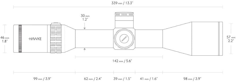Hawke Sidewinder Sidewinder serien er skræddersyet til langdistance skydning under alle forhold. Med 18 lags multi-coatede linser, udvendige kliktårne, paralaxe justering, solblænde og lysprik, lever disse kikkerter op til de strenge optiske og mekaniske krav der stilles til de helt lange skud! testet op til kaliber .338 lapua magnum. Nitrogen fyldt og 100 % vandtæt. Alle modeller leveres med Hawke’s nye H5 optik med 24º ultra-wide synsfelt, zoom lever, 4” solblænde, 4” sidefokus hjul og “pointer”, metal flip-up linsebeskyttere og 2 stk. CR2032 batteri samt Hawke livstidsgaranti.
