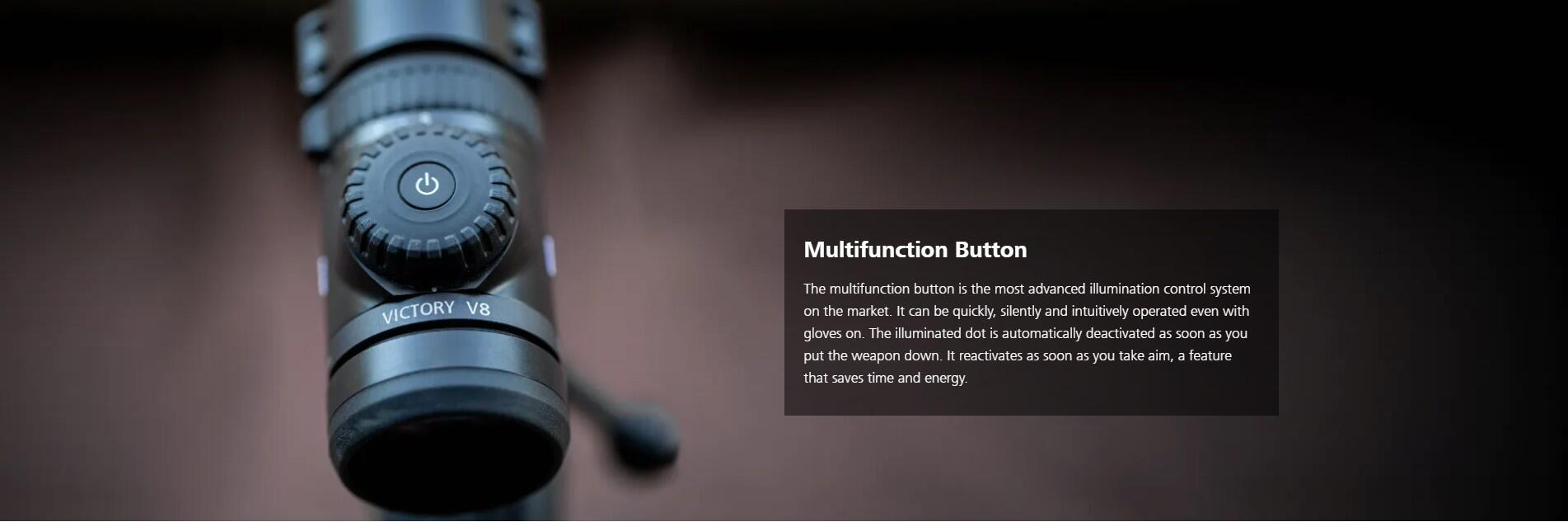 Udover det ekstremt brede zoomområde udmærker V8 serien sig med et ekstra bredt justeringsområde for træfpunktjusteringen hvilket muliggør skydning på meget lange afstande. Den oplyste center-prik er den mindste, mest lysstærke og skarpest definerede blandt premium kikkerter og den kan justeres til alt fra natjagt i svagt månelys til jagt i fuldt sollys. ASV kuglebanekompensatoren - der tilpasses netop den ladning du bruger - gør det enkelt at justere træfpunktet hurtigt og effektivt på basis af en afstandsmåling.