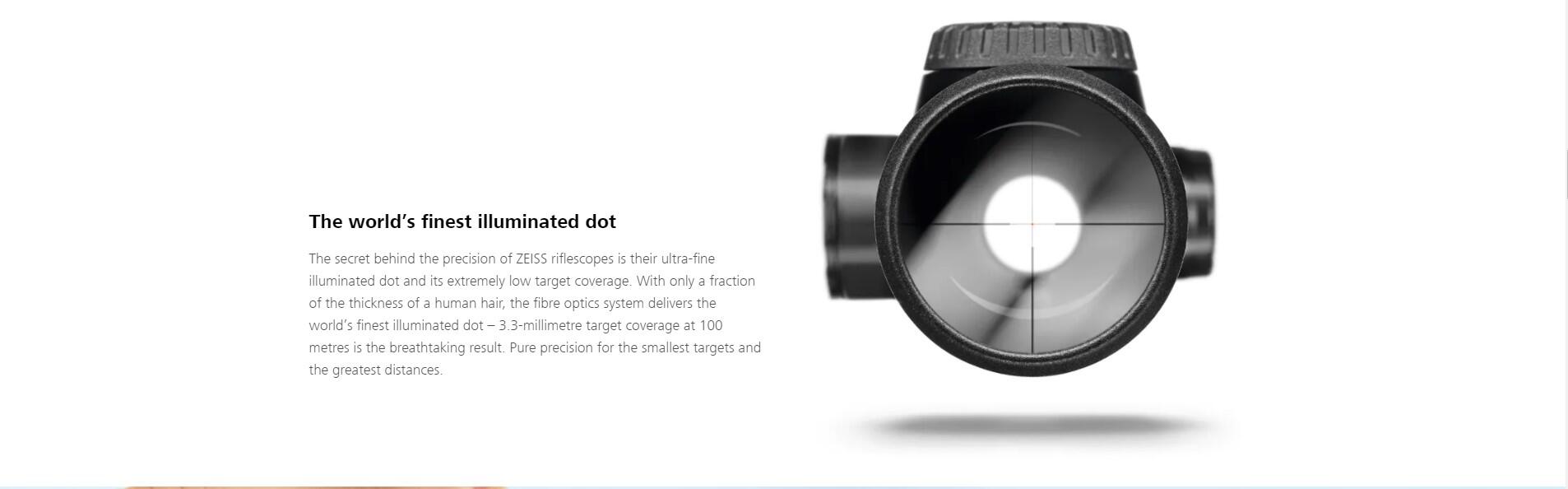 Verdens mindste, mest lysstærke og skarpest definerede oplyste center-prik. Døkker under 5 mm af målet på 100 meters afstand, men er ikke desto mindre klar og tydelig.