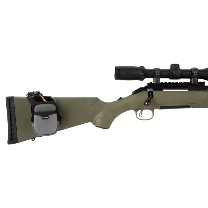 Denne smarte lille taske fastgøres direkte på kolben af din riffel eller haglgevær med et slidstærkt og fleksibelt silikonebånd, som hverken ridser eller slider på våbnet. Den sidder godt fast – også under bevægelse – og passer til alle typer kolber.