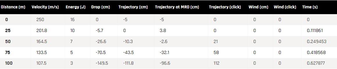 Højere hastighed og fladere ballistisk bane er de vigtige kendetegn ved denne ammunition. Mundingshastigheden er 250 m/s, hvis luftgeværets effekt er sat til 16J.