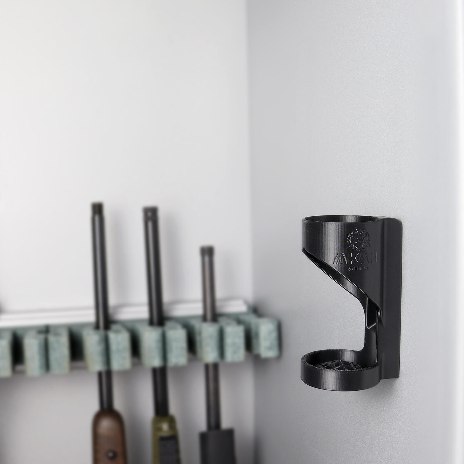 Plastik lyddæmperholderen har en stærk magnet på bagsiden, der forhindrer uønsket glidning. De to "nøglehuller" muliggør nem fastgørelse til passende overflader. Den opadbuede ventilationsrist på undersiden af holderen sikrer god luftcirkulation og centrerer lyddæmperen.