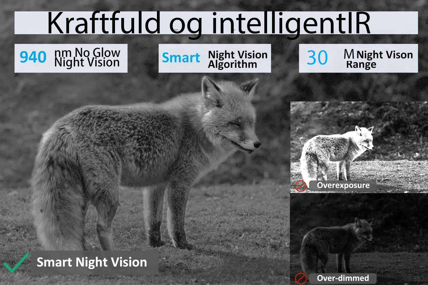 Lav batterialarm 8V - Lavt batteri (batterier tomme), 9V - Natvision utilgængelig ved lav spænding (næsten tomt)